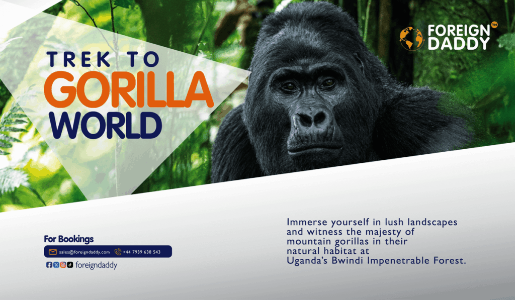 Embark on the “Trek to Gorilla World – Uganda,” a three-day Gorilla Trekking adventure in Uganda’s Bwindi Impenetrable Forest.
